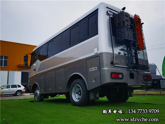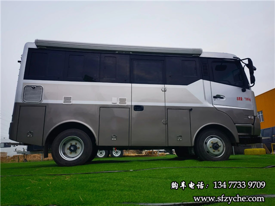 車(chē)身右側(cè)配備了4m的電動(dòng)遮陽(yáng)棚、市電接口、尾部工具箱、戶外照明燈,中置上客門(mén),副駕駛乘客門(mén),車(chē)輛門(mén)鎖均采用越野專用倉(cāng)門(mén)鎖。