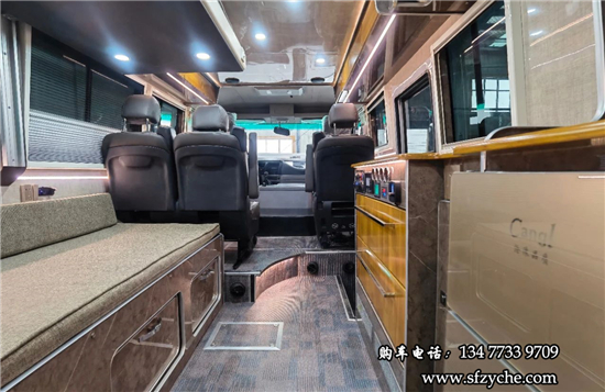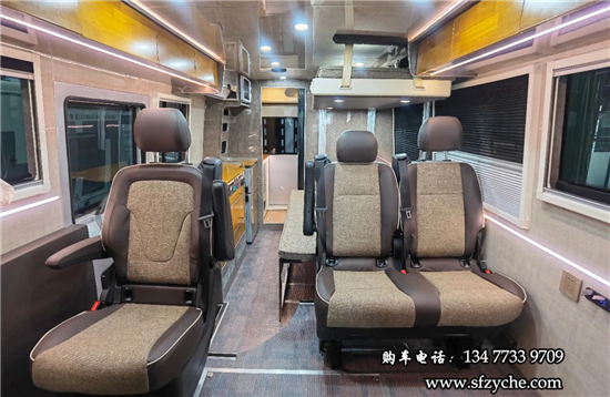 得益于方正的車(chē)身,車(chē)內(nèi)空間非常寬敞,內(nèi)寬可達(dá)2米。布局方面從前往后依次是駕駛區(qū)、乘坐區(qū)、生活區(qū)和尾部的廚衛(wèi)區(qū)域。整車(chē)核載5人,車(chē)廂中部采用2+1座椅布局,全部帶有扶手和頭枕,乘客座椅全部朝前設(shè)計(jì),增加了乘坐的舒適度。