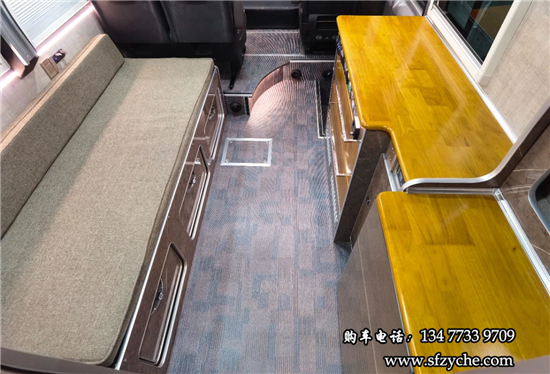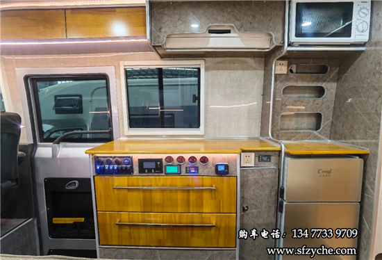單人座椅后方是中置上客門(mén),在后方是一體式櫥柜,下方帶有儲(chǔ)物抽屜,上方暗藏了一臺(tái)家用變頻空調(diào),乘客門(mén)上方也提供了多個(gè)儲(chǔ)物吊柜,儲(chǔ)物空間充足。櫥柜旁鑲嵌了一臺(tái)108L上下雙開(kāi)門(mén)的冰箱,上方則是一臺(tái)微波爐,側(cè)面的壁板上還帶有電源插座。