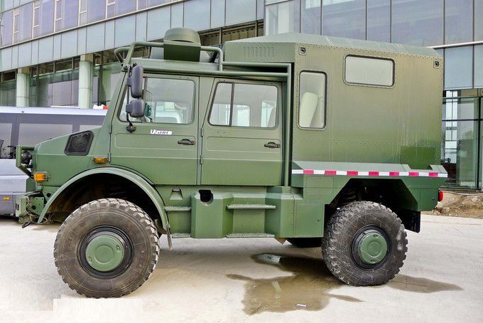 底盤介紹:烏尼莫克U5000擁有兩種軸距分別為3250mm和3850mm,6m的車身長度配合將近2.5m的寬度讓車內(nèi)的空間利用率發(fā)揮到了極致。車頭部分的高度已經(jīng)將近3m,如果加上后加裝的車廂,各位可以想象遇到較低的限高時是多么尷尬。門式車橋在此無需多言,接近500mm的離地間隙,再加上1.2m的涉水深度足以面對所有極限路況,此外選裝軍版套件的涉水深度可以達(dá)到1.5m。其零部件及電氣元件有防水保護(hù)、再配合防水式前大燈,輪轂、制動器密封等讓這輛猛獸無所不能。除了基本的車身防護(hù)裝備,“鵝頸式”縱梁的布置,使梯形車架與兩個相對的縱梁構(gòu)成一個U字型,并焊接在管狀縱梁上,可允許橫縱梁產(chǎn)生較大的扭轉(zhuǎn)度,通過橫向推桿與螺旋彈簧間的聯(lián)動,能實(shí)現(xiàn)高達(dá)30度的車橋?qū)桥で。而三點(diǎn)式懸掛也是烏尼莫克實(shí)現(xiàn)極端越野的關(guān)鍵之一,當(dāng)車輛需要對角行駛以越過高差超過0.5米的障礙物時,三點(diǎn)式懸掛可以保證車輛形成大角度移動和扭轉(zhuǎn)。相對于粗狂的外形,烏尼莫克式的內(nèi)飾也顯得相當(dāng)質(zhì)樸,在提倡減少控制面板按鈕的時代,U5000也有著自己的詮釋,那就是將所有舒適裝備盡可能的簡單化,最大化的給輔助駕控的功能按鈕預(yù)留空間。UG 100-8型變速器具備8前進(jìn)擋、6倒擋帶手自一體功能,其前進(jìn)擋速比為9.57-0.73,倒擋速比為14.56-1.12。兩級常開閥發(fā)動機(jī)制動在這種允許載重超過12500kg的龐然大物上相當(dāng)實(shí)用。看到這樣的空調(diào)面板,你是否會感覺自己回到了90年代,具備三把鎖的U5000,再配合4.8L直列四缸渦輪增壓中冷直噴柴油發(fā)動機(jī)所迸發(fā)出的160kW/2200rpm功率、810Nm/1600rpm扭矩的強(qiáng)大動力數(shù)據(jù),足以保證其優(yōu)異的越野性能,當(dāng)然你還可以再選裝中央輪胎自動充放氣系統(tǒng)。