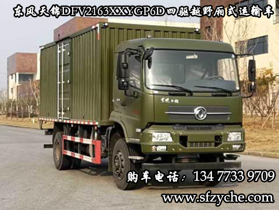 東風(fēng)牌DFV2163XXYGP6D型四驅(qū)越野廂式運(yùn)輸車:整車外形尺寸長寬高7760,7960X2500,2550X3380,3580(mm)、廂體內(nèi)部尺寸長寬高5400,5600X2400,2450X1900,2100(mm);廂體選裝瓦楞板設(shè)計(jì),底板4mm花紋板,后對(duì)開門,側(cè)單開門。適用于山區(qū)道路、戈壁灘道路的物資運(yùn)輸。