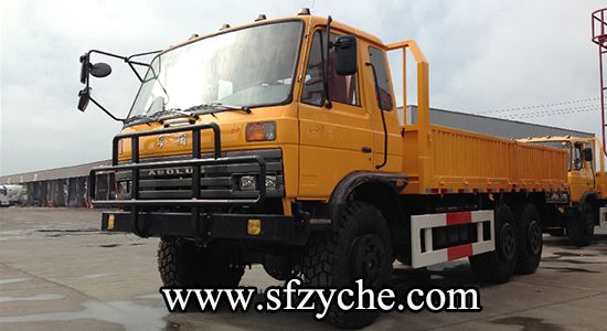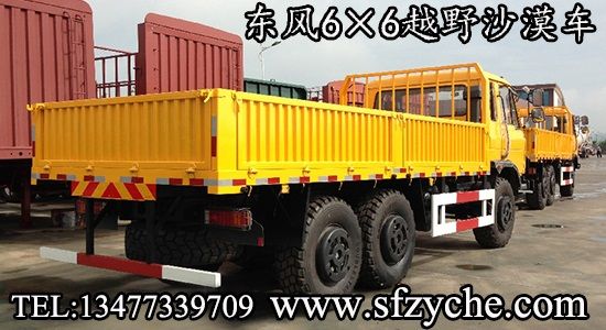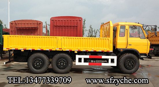 2、詳細配置:平頭一排半駕駛室,6*6驅(qū)動,康明斯190馬力,韶齒6檔變速箱,斷氣彈簧制動,貫通式中后驅(qū)動橋,12.5R20越野胎,軸距 3500+1250mm,加厚雙層大梁,貨箱4850mm,帶軍用保險杠。(新款仿天錦駕駛室加價1.5萬元)東風(fēng)越野卡車:m.xunta001.com