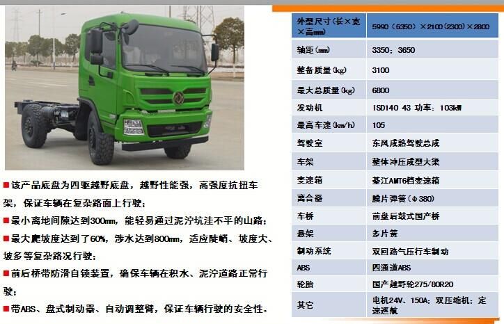 EQ2070GZ4DJ越野四驅(qū)底盤(pán)的詳細(xì)描述:該產(chǎn)品底盤(pán)為四驅(qū)越野底盤(pán),越野性能強(qiáng),高強(qiáng)度抗扭車(chē)架,保證車(chē)輛在復(fù)雜路面上行駛時(shí),不會(huì)出現(xiàn)大梁斷裂等情況;最小離地間隙達(dá)到300mm,能輕易通過(guò)泥濘坑洼不平的山路;最大爬坡度達(dá)到了60%,適應(yīng)陡峭、坡度大、坡多等復(fù)雜路況行駛。前后橋帶防滑自鎖裝置,確保車(chē)輛在積水、泥濘道路正常行駛;帶ABS、盤(pán)式制動(dòng)器、自動(dòng)調(diào)整臂,保證車(chē)輛行駛的安全性。