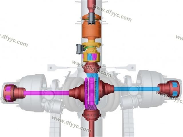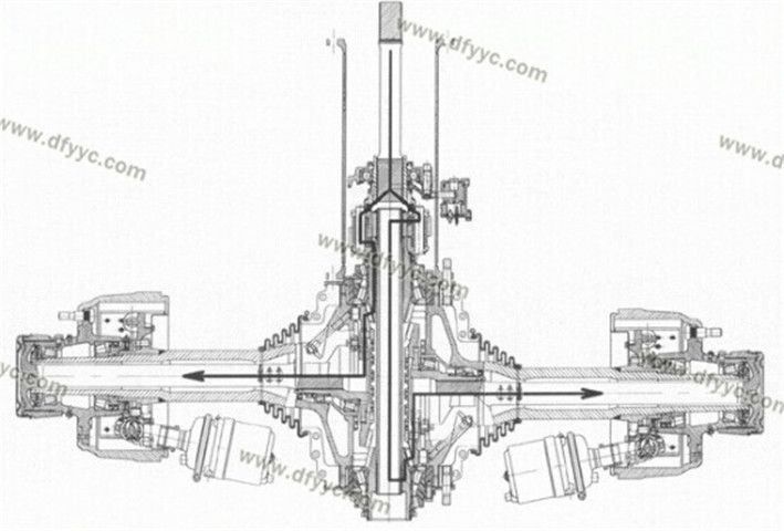 另外,這種斷開(kāi)式車(chē)橋的輪間差速器并不在橋包中,而是被轉(zhuǎn)移到了脊柱套管了,左右側(cè)車(chē)輪分別由兩套錐齒輪驅(qū)動(dòng),為了讓這兩套錐齒輪互不干涉,其左右半軸在縱向錯(cuò)開(kāi)了一定的距離,也就是說(shuō)它的兩個(gè)半軸并不在一個(gè)平面內(nèi)。類(lèi)似的設(shè)計(jì)手法裝載機(jī)(4X4軸轉(zhuǎn)向的裝載機(jī))上也有使用,還有采用錯(cuò)開(kāi)一定角度的做法來(lái)避免左右錐齒輪互相干涉的情況。